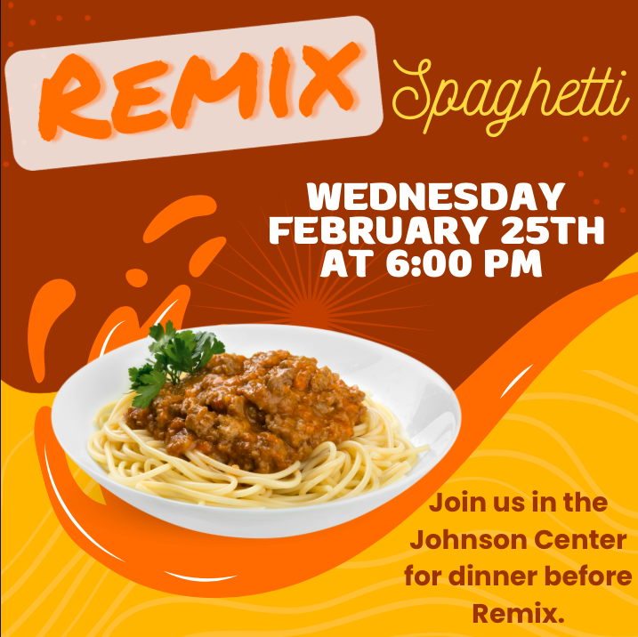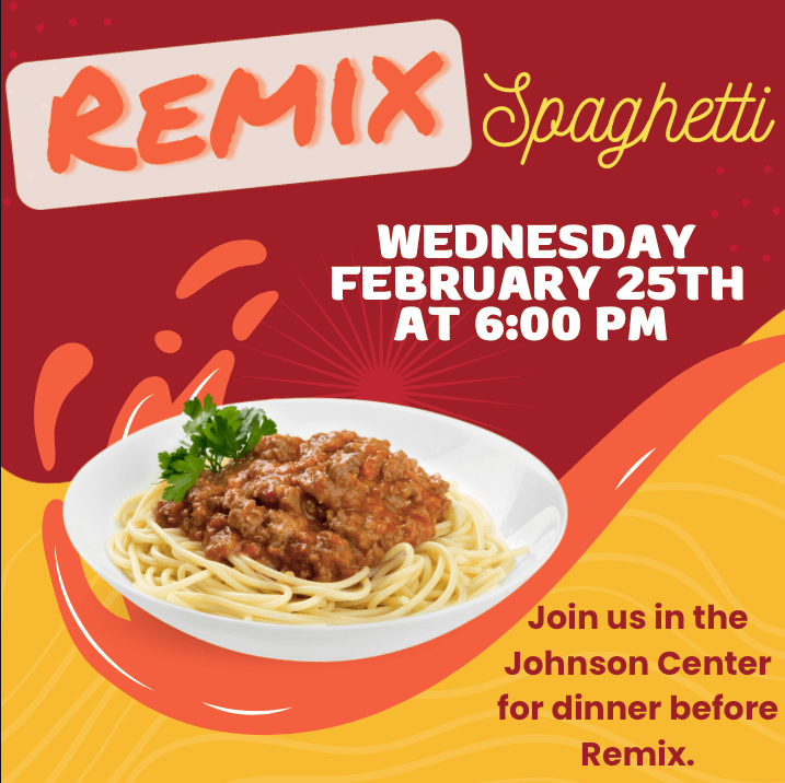 Tonight is Elevate Remix, and the doors will be opening at 6:00 PM for Spaghetti Wednesday, regular hangout time will start at 6:30 PM , and Remix will be happening from 7:00-8:30 PM.