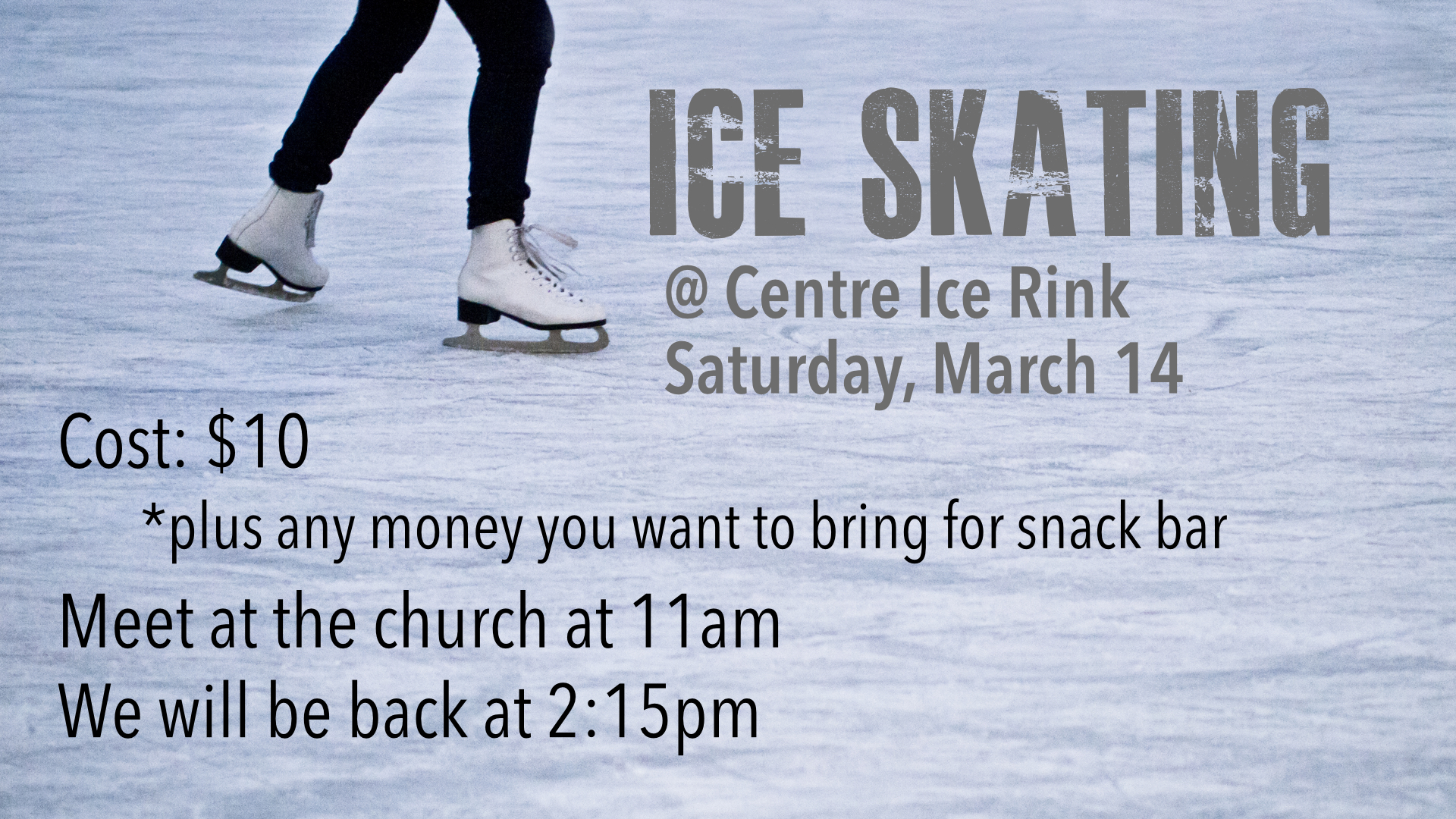 Ice Skating THIS SATURDAY! (3/13) Posted by lncelevate on March 13, 2015 Posted in: Uncategorized. Leave a comment You MUST have a signed permission slip to go. You can download a copy here: permission slip Share this: Share on X (Opens in new window) X Share on Facebook (Opens in new window) Facebook Like Loading... Related Posts navigation ← Elevate Worship Team God’s Table Menu Items Needed →