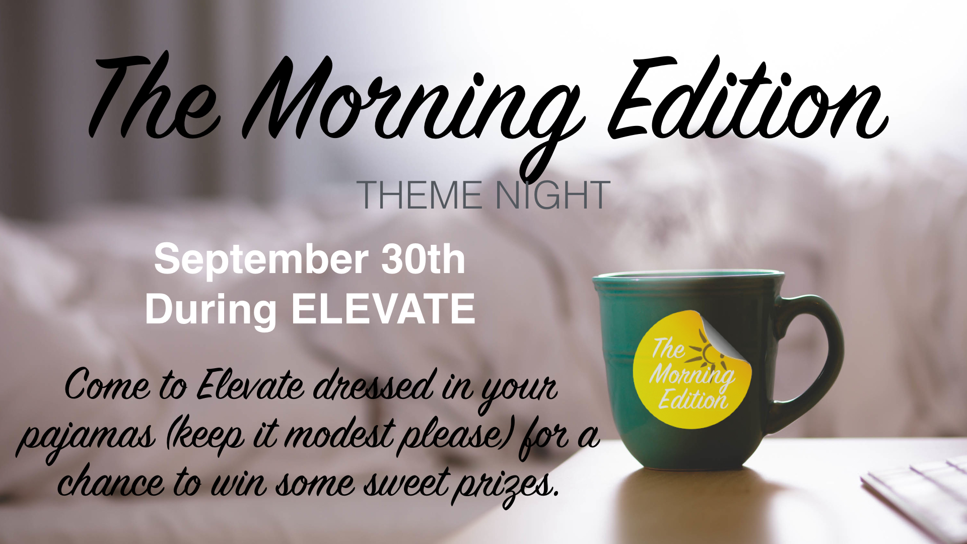 “The Morning Edition” Theme Night is TONIGHT! (9/30) Posted by lncelevate on September 30, 2015 Posted in: Uncategorized. Leave a comment Come hungry! We will have some really good breakfast foods like pancakes during Elevate. During the message tonight we will be talking about God’s wake up call in our lives. Share this: Click to share on X (Opens in new window) X Click to share on Facebook (Opens in new window) Facebook Like Loading... Related Posts navigation ← Parents Meeting THIS SUNDAY (9/27) Elevate Wearables Orders →
