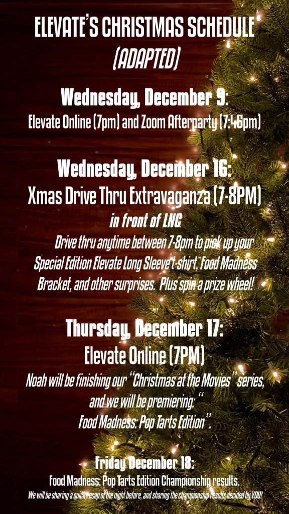 Elevate’s Adapted Christmas Schedule Posted by lncelevate on December 10, 2020 Posted in: Uncategorized. Leave a comment Share this: Share on X (Opens in new window) X Share on Facebook (Opens in new window) Facebook Like Loading... Related Posts navigation ← Elevate’s Zoom Afterparty Elevate Adapted (again!) Schedule →