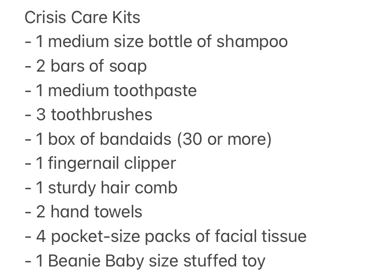 Crisis Care Kits Posted by lncelevate on May 17, 2021 Posted in: Uncategorized. Leave a comment Crisis Care Kit items due this Wednesday! (May 19) Whoever brings the most items wins a prize! Share this: Share on X (Opens in new window) X Share on Facebook (Opens in new window) Facebook Like Loading... Related Posts navigation ← Previous Post Elevate on the Road →