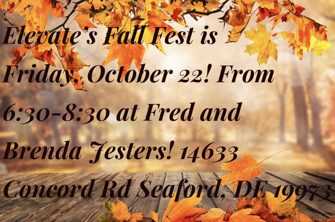 Elevate’s Fall Fest is Friday, October 22! 6:30-8:30pm! Posted by lncelevate on September 20, 2021 Posted in: Uncategorized. Leave a comment At Fred and Brenda Jesters, 14633 Concord Rd Seaford, DE 19973. We will have fall food, games, corn maze, photo booth, and a campfire! *wear comfortable clothes and shoes that you can run in!! Share this: Share on X (Opens in new window) X Share on Facebook (Opens in new window) Facebook Like Loading... Related Posts navigation ← Elevate’s Fall Calendar Next Post →