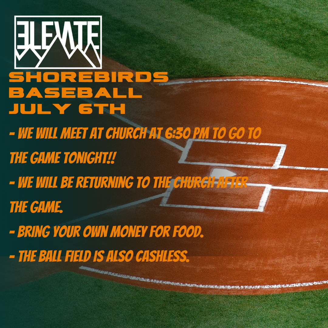 We will be meeting at the church at 6:30 PM to load up and go down to the ballpark. Our goal is to leave the church by 6:45 PM.