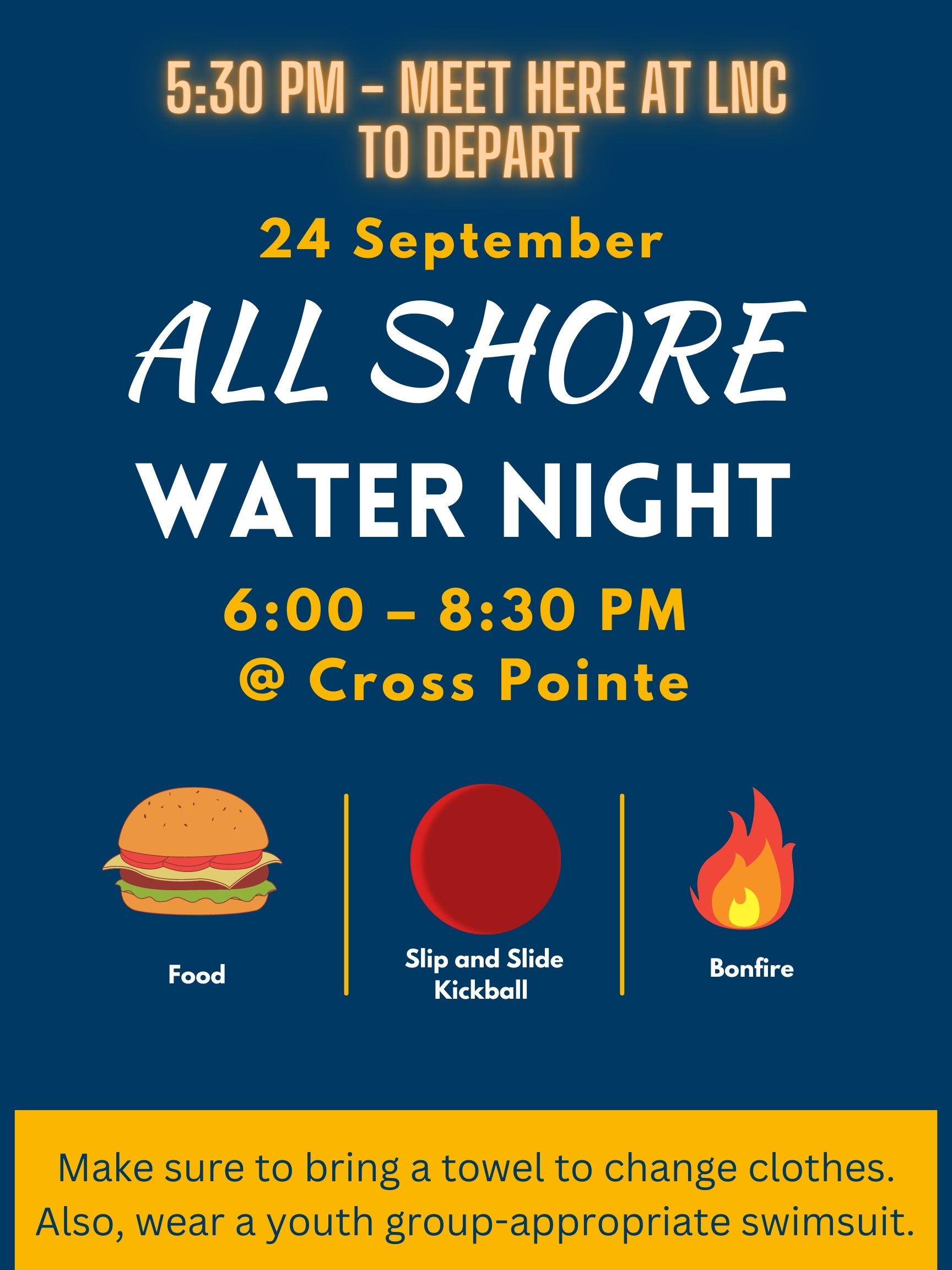 All Shore Gathering Posted by lncelevate on September 21, 2022 Posted in: Uncategorized. Leave a comment The All Shore Gathering is this Saturday! We will meet at the church at 5:30pm and be back around 9:00pm. Hope to see you there! *Make sure to wear a bathing suit and bring a towel; we will be playing Slip and Slide Kickball! Share this: Click to share on X (Opens in new window) X Click to share on Facebook (Opens in new window) Facebook Like Loading... Related Posts navigation ← Elevate Reminder 9/7/22 Elevate Fall Party!! Oct. 22nd →