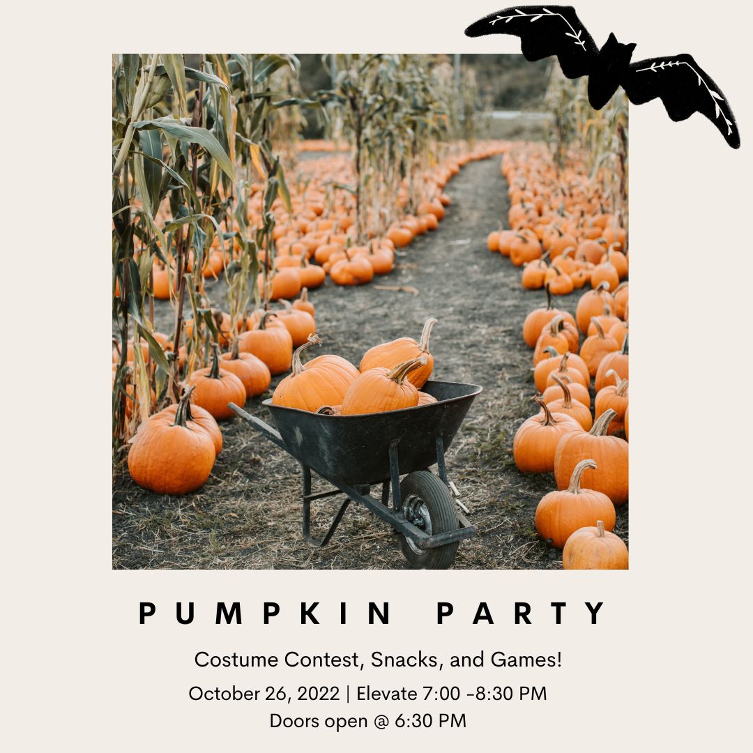 This Wednesday night, October 26th, is our Pumpkin Party! Join us for a costume contest, pumpkin-themed games, and food. This will be happening during our regular Elevate time on Wednesday night. Hope to see you there!