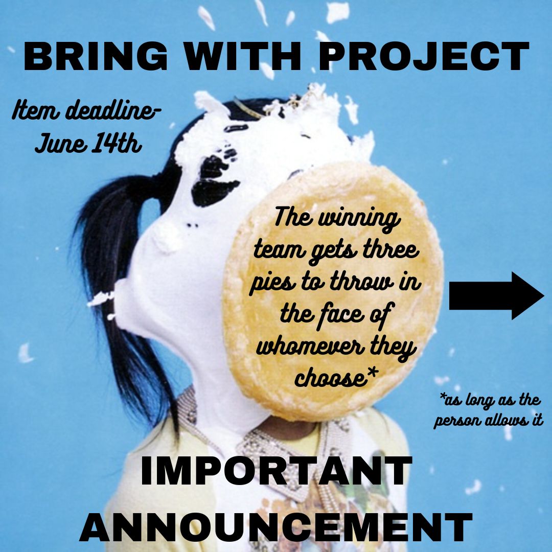 What’s up, Elevate! We have an important announcement for the Bring With Project. The team that gathers the most stuff will get three pies to throw in the faces of anyone at Elevate, including both leaders and students (as long as they allow it). The number of items will be tallied after Elevate on June 14th to determine whether the boys or girls won. Pies will be thrown at Elevate on June 28th.