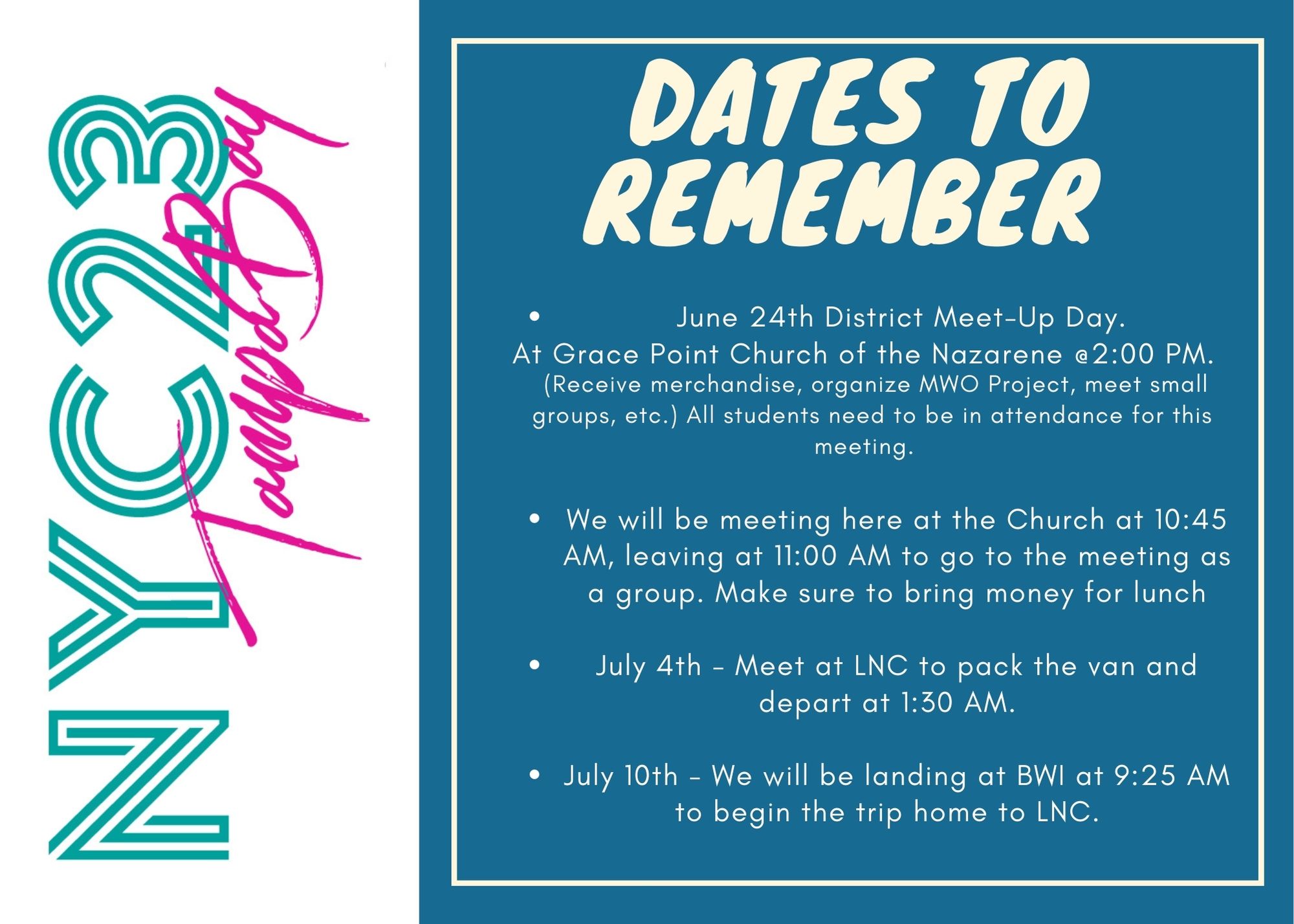 The District Meet Up Day is this Saturday at Grace Point Church of the Nazarene at 2:00 PM, and you must be in attendance. (Please let P. Caleb know if you will be attending by Wednesday June 21st.) We will meeting here at LNC at 10:45 AM to leave the church at 11:00 AM. You also, need to bring money for lunch. We will keep you as parents posted on our return time.
