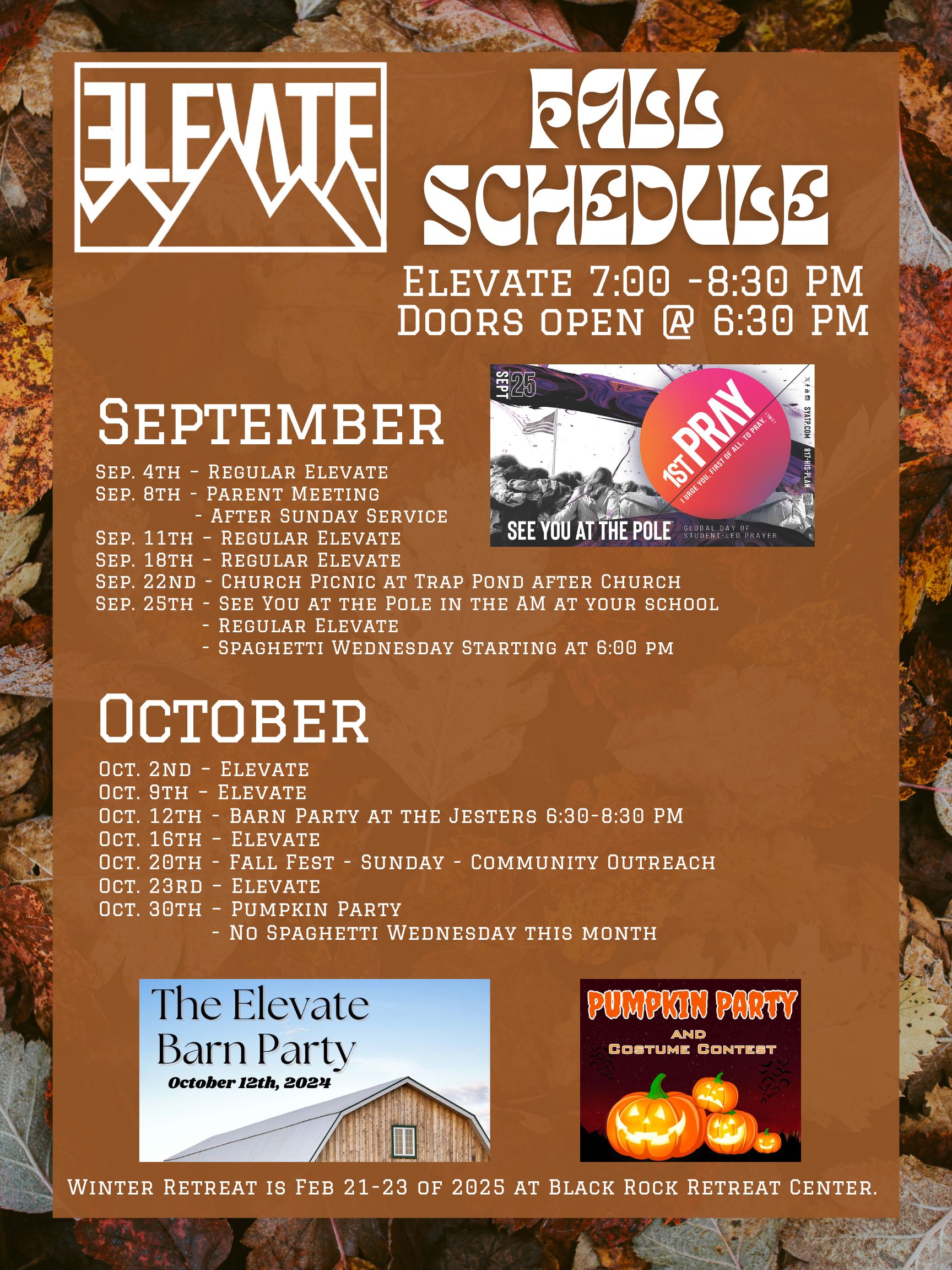 We are ready for an awesome fall here at Elevate, check out what we have planned. These will be available for download on Elevateparents.org, and we will also have them printed out for the students to take home this week.