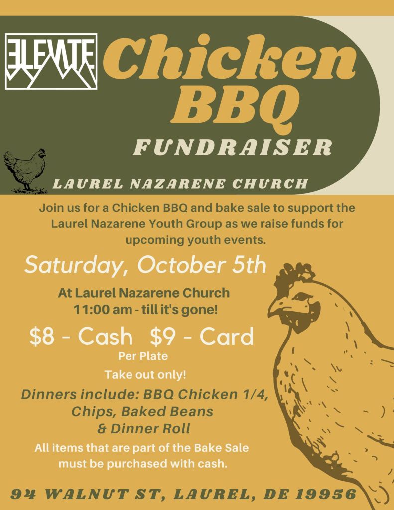 CHICKEN BBQ – Elevate Youth Fund Raiser – at Laurel Nazarene Church, 94 Walnut Street, Laurel, DE. -take out only.
