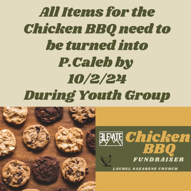 Please make sure to have all items for the Chicken BBQ that you have signed up to donate turned into Pastor Caleb on 10/2/24 before youth group. (That is tonight!)
