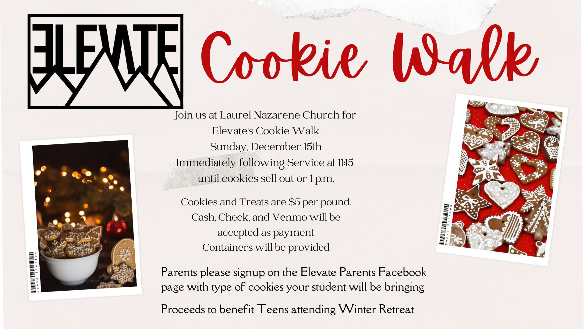 The Cookie Walk will be happening on December 15th at 11:15 am. We still need to know what kind of cookies you all will be bringing. Please let us know on the Elevate Parents Facebook page what kind of cookies you will be bringing. We are recommending 3-5 dozen cookies per student attending Winter Retreat.