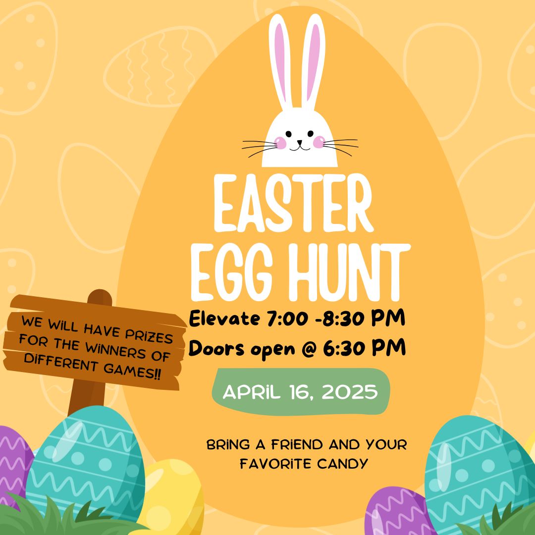 Elevate Easter Egg Hunt – Apr. 16th Posted by lncelevate on April 14, 2025 Posted in: Uncategorized. Leave a comment This Wednesday night is our Elevate Easter Egg Hunt. Bring a friend and bring your favorite kind of candy to share. We can’t wait to see you all there!!! Share this: Share on X (Opens in new window) X Share on Facebook (Opens in new window) Facebook Like Loading... Related Posts navigation ← April – June 2025 Elevate Remix Schedule Join us for Holy Week! →