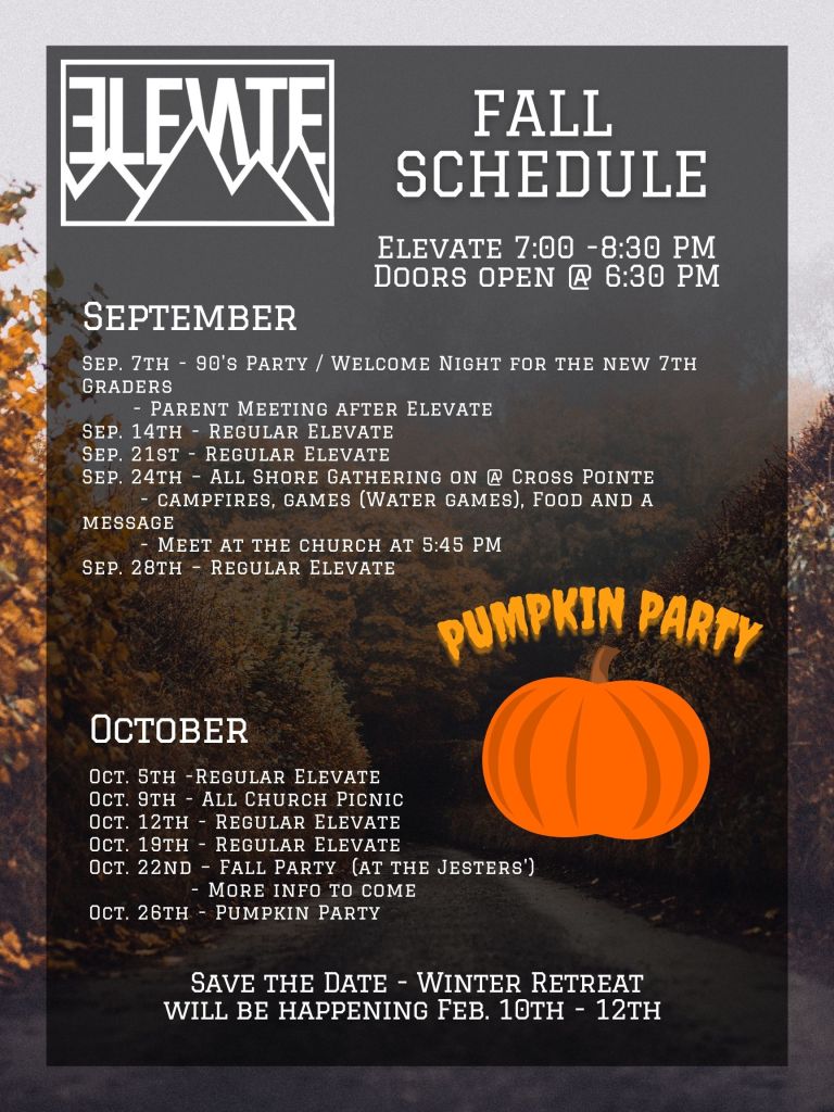 Wednesday night, October 26th, is our Pumpkin Party! Join us for a costume contest, pumpkin-themed games, and food. This will be happening during our regular Elevate time on Wednesday night. Hope to see you there!