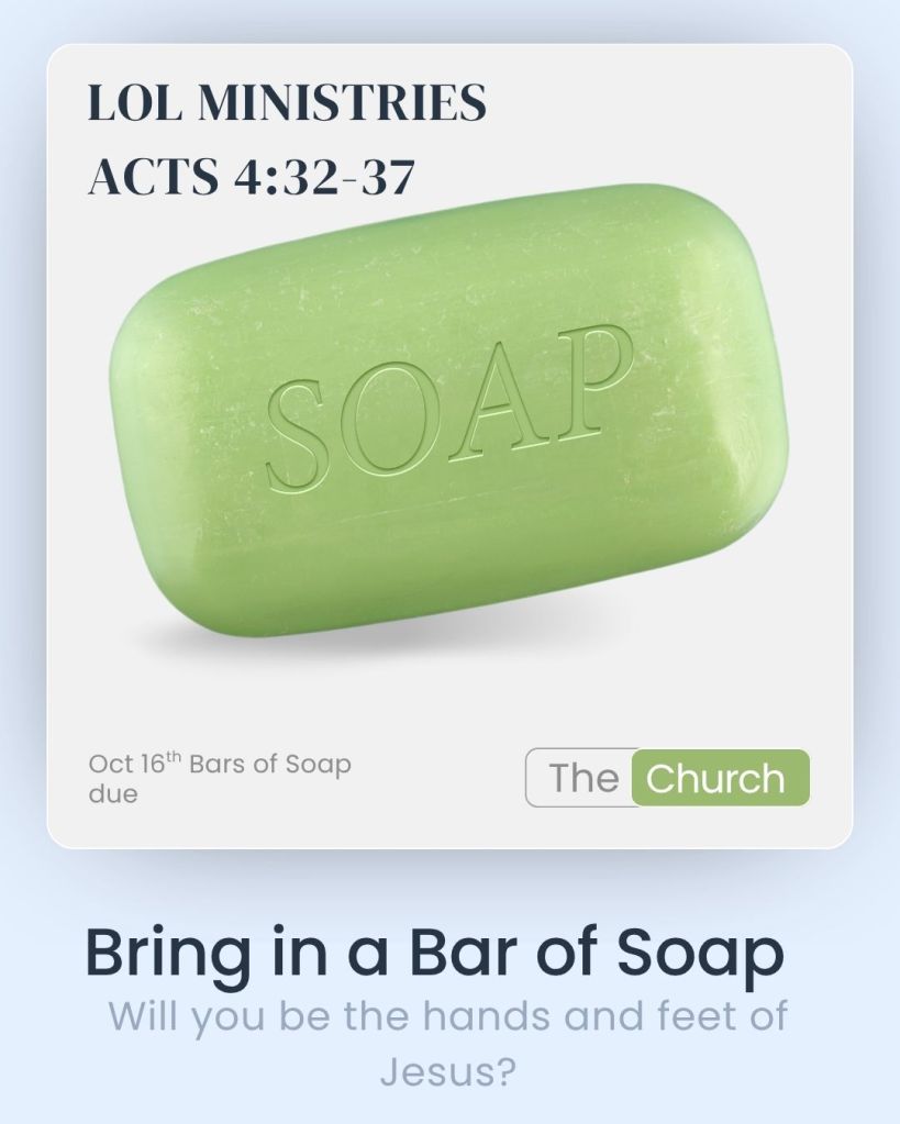 We will be partnering with the Laugh Out Loud Ministry and Orphanage to be the hands and feet of Jesus, “The Church”. They are in need of soap. We are asking students to bring in one bar of soap by Oct. 16th so it can be mailed to the Orphanage in Belize.